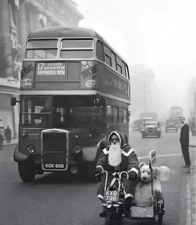 1949 年 12 月 17 日✿◈◈◈:圣诞老人骑着带边车的摩托车✿◈◈◈,沿着国外伦敦的牛津街行驶✿◈◈◈。